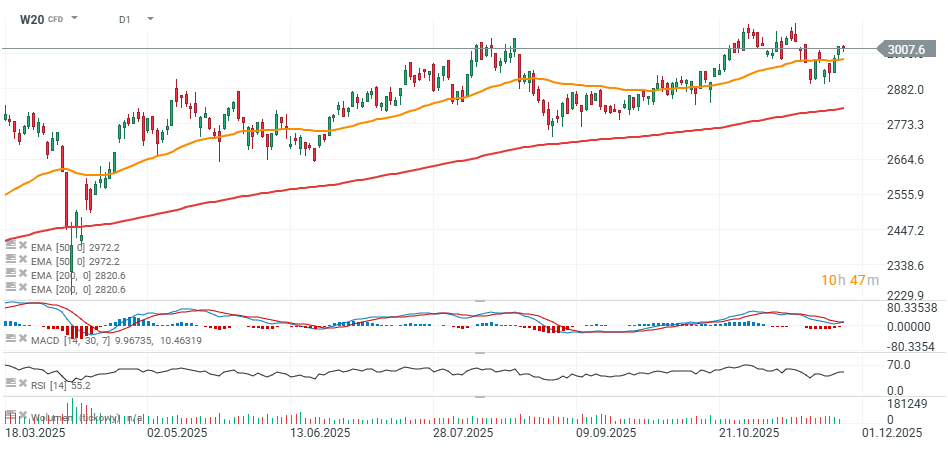 Polski indeks notowany jest nieznacznie niżej, ale utrzymuje się powyżej kluczowej średniej EMA50, sugerujac, że krótkoterminowy trend pozostaje wzrostowy.