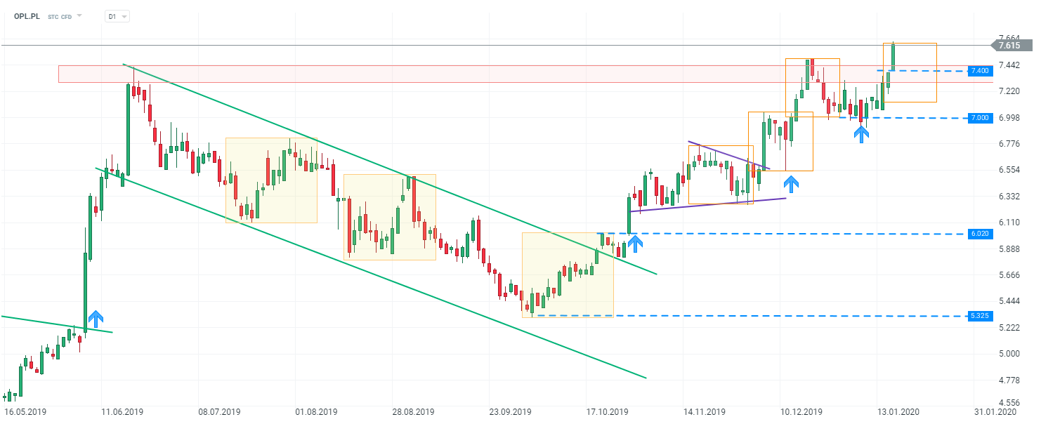 Na początek przyjrzyjmy się sytuacji technicznej na najlepiej i najgorzej radzącej sobie dziś spółce. W czwartek największe wzrosty możemy obserwować na Orange Polska (OPL.PL), gdzie ruch wynosi blisko +4%. Patrząc na wykres wybijane są kolejne nowe maksima. W ostatnich analizach z cyklu Puls GPW wielokrotnie wspominaliśmy o pro wzrostowej sytuacji na tym walorze. Rynek po raz kolejny zachował się technicznie i po obronie dolnego ograniczenia układu Overbalance zdołał wyjść na nowe maksima. Tym samym wybita strefa przy poziomie 7 zł i 40 groszy powinna być traktowana w najbliższym czasie jako wsparcie. Z kolei dopiero zejście poniżej okrągłego poziomu 7,00, będzie świadczyć o zmianie tendencji na spadkową.