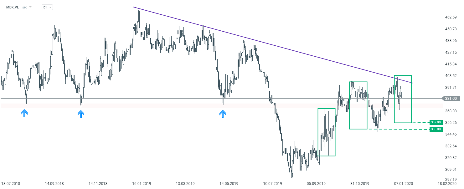 Po drugiej stronie rynku znajduje się dziś mBank (MBK.PL), który traci ponad 2%. Dziś bank podał informację o utworzeniu rezerwy na kredyty we franku szwajcarskim, która wynosi 293 miliony złotych. Rezerwa ta stanowi 1,7% wartości całego portfela walutowych kredytów hipotecznych banku. Patrząc technicznie na wykres, w ostatnim czasie doszło do nieudanej próby wybicia linii poprowadzonej po ostatnich wierzchołkach. Spadki wyhamowały jednak w strefie wsparcia przy 394 zł za akcję, która dalej może stanowić podporę dla kupujących. Gdyby jednak doszło do jej przełamania, jako kolejne wsparcia należy brać pod uwagę poziomy 357 i 350 zł. Dopiero ich wyłamanie świadczyłoby o większych spadkach. Z kolei gdyby najbliższym czasie doszło do przełamania górą fioletowej linii trendu, ruch w górę może przyspieszyć.