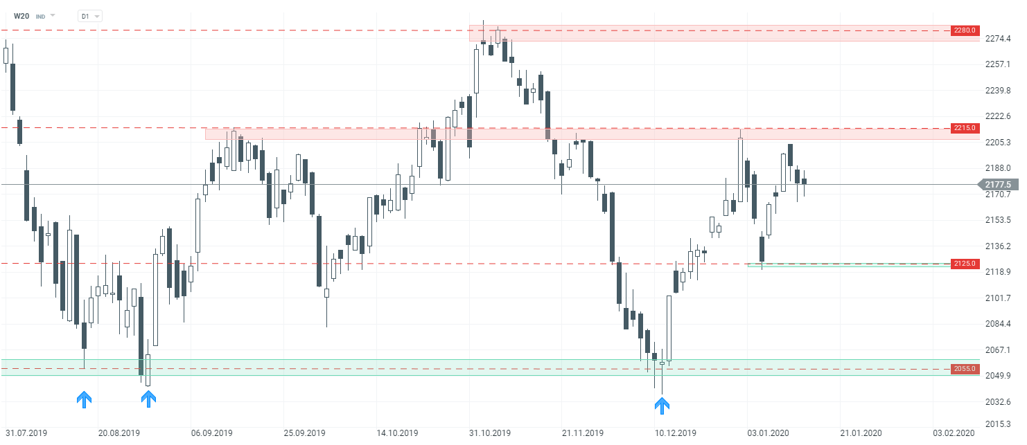 Jeśli chodzi o sytuację techniczną na indeksie 20-stu największych spółek (W20) nie uległa ona większej zmianie. Zmienność podczas dzisiejszej sesji jest dużo mniejsza niż wczoraj. Na interwale D1 kluczowym oporem pozostaje strefa przy 2215 pkt, o której pisaliśmy we wczorajszym artykule z cyklu Puls GPW. Jeżeli sentyment nie ulegnie poprawie, to wciąż istnieje szansa na test dołków z 8 stycznia przy 2125 pkt. Z kolei gdyby w najbliższym czasie doszło do pokonania bariery podażowej, droga w kierunku 2280 pkt zostanie otwarta.
