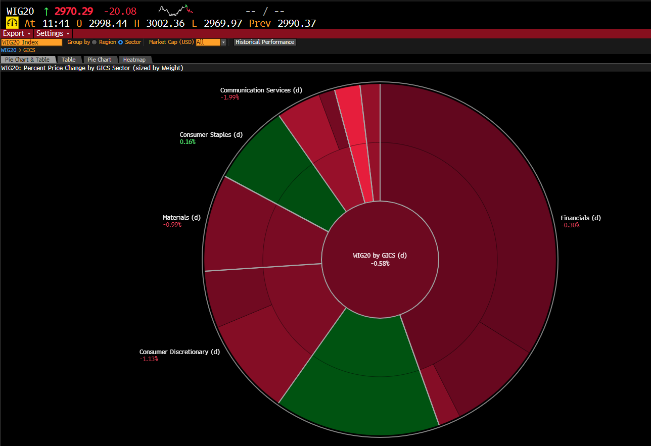 Spadki na Polskich indeksach są szerokie, na głównym Indeksie najbardziej obciążone okazuje się IT, detaliści oraz spółki wydobywczo-energetyczne. Lepiej radzą sobie dziś natomiast banki.