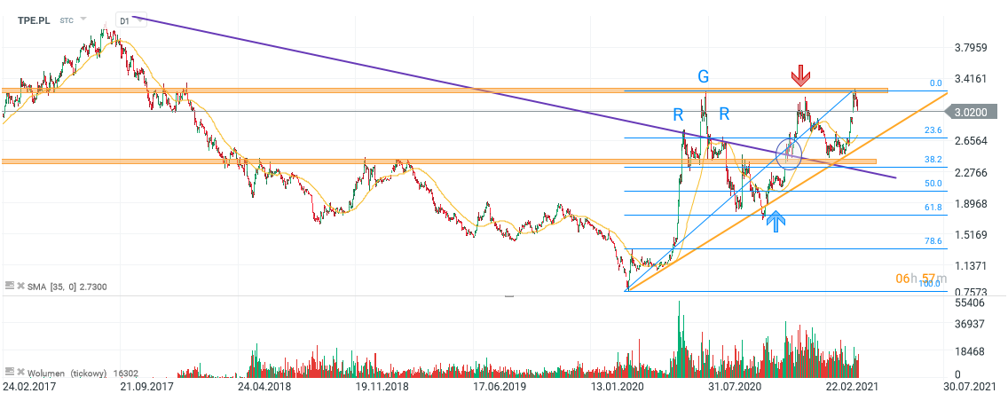 Dzisiejsza analiza techniczna poświęcona będzie spółce Tauron Polska Energia (TPE.PL). W trakcie ostatnich sesji walor zmagał się z kluczowym poziomem 3,25 zł. Dzisiejsze cofnięcie -głównie za sprawą planu transformacji sektora energetycznego, przedstawionego przez Ministerstwo Aktywów Państwowych, jeszcze nie przekreśla rozpoczętego wybicia na północ. Akcje spółki po udanym przełamaniu wieloletniej linii trendu spadkowego, trzykrotnie już przeprowadzały atak na lokalny opór 3,25 zł. Przy wycofaniu z wspomnianego rejonu, poziomami wsparcia mogą być odpowiednio 2,70 zł oraz 2,45 zł.