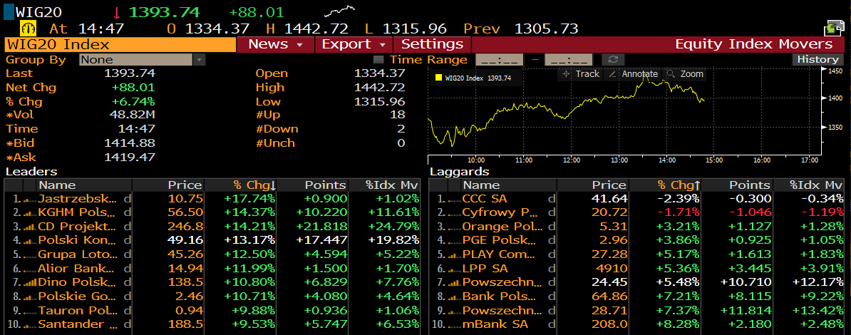Wczorajsza sesja na GPW wpisała się jako najgorsza w historii, indeks dwudziestu największych spółek stracił ponad 13%. Niemniej za sprawą działania banków centralnych w piątek możemy obserwować wyraźne odreagowanie. O poranku wszystkie główne indeksy giełdowe w Europie znajdują się na solidnym plusie, a rekordzistą jest włoski FTSE MIB, który zyskiwał nawet 15%. Warto jednak pamiętać, aby nie popadać zbyt szybko w przesadną euforię, sytuacja wciąż jest dynamiczna i wczoraj ponownie został ustawiony rekordowy przyrost odnotowanych przypadków koronawirusa. Jeżeli kolejne kraje będą się decydować na wstrzymanie ruchu komunikacyjnego w kraju (jak Włochy), sytuacja może ulec pogorszeniu. W piątek aż 18 spółek z WIG20 znajduje się na plusie. Pod kreską pozostają tylko Cyfrowy Polsat i CCC.