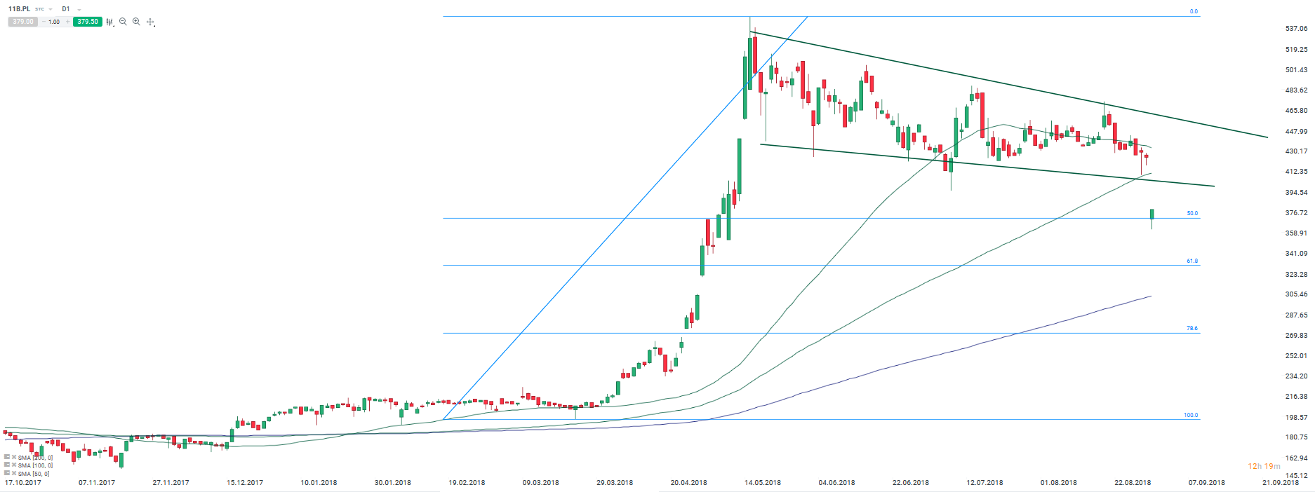 Spółka po wynikach otworzyła się kilkunastuprocentową luką spadkową na poziomie zniesienia 50% fali wzrostowej, która napędzana była debiutem Frostpunka. Źródło: xStation5.
