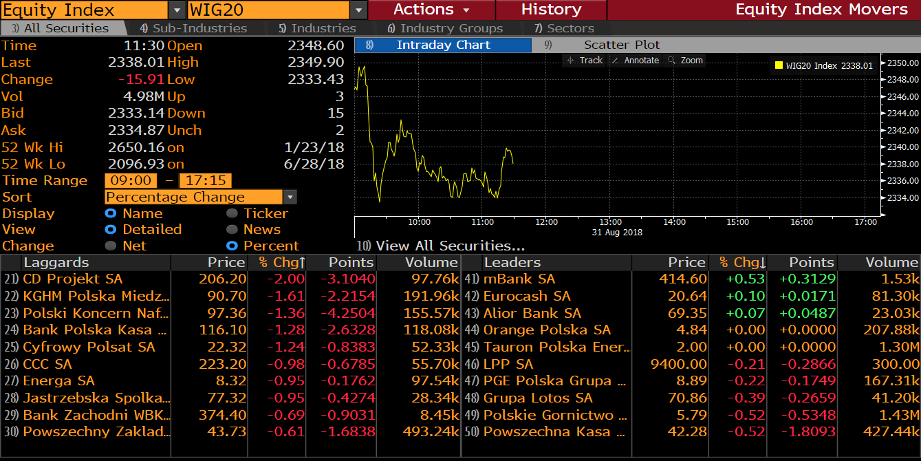 O poranku poznaliśmy dane o PKB za II kwartał z polskiej gospodarki. Szacunek wzrostu gospodarczego wyniósł 5,1% r/r, co jest wynikiem tylko minimalnie gorszym od okresu pomiędzy styczniem a marcem. Jest to drugi kwartał z rzędu wzrostu powyżej 5%, a ostatnim razem z taką sytuacja mieliśmy do czynienia w 2011 roku. Silnym punktem była konsumpcja oraz nadwyżka handlowa. O poranku opublikowane zostały także dane o inflacji, która utrzymała się na niezmienionym poziomie 2%. Głównym powodem takiego stanu rzeczy były z pewnością rosnące ceny paliw, jednak prognozy na kolejne okresy sugerują spadek inflacji. USDPLN po wczorajszych wzrostach spowodowanych negatywnym sentymentem do walut rynków wschodzących pozostaje stabilny i oscyluje w okolicach 3,6820.