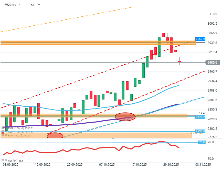 Kurs kontynuuje realizacje formacji podwójnego szczytu, do której daj sygnał pod koniec zeszłego miesiąca. Kupującym nie udało się zanegować scenariusza spadkowego. Następne wsparcie znajduje się na poziomie 2960, gdzie znajduje się linia trendu (czerwona) oraz średnia EMA50.