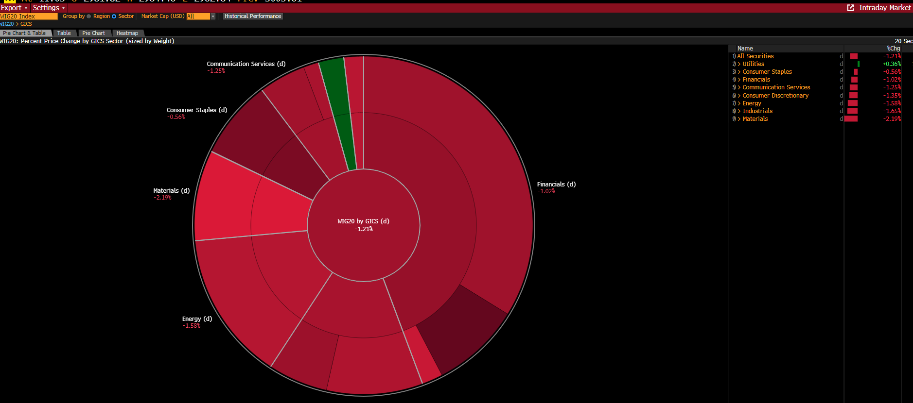 Indeks WIG20 notuje zauważalne spadki na całej swojej rozpiętości. Najpoważniejsze spadki notują spółki wydobywcze i energetyczne. KGHM traci aż 2,5%. Na wyraźnym minusie są dziś też banki i finanse, tracąc średnio ponad 1%.