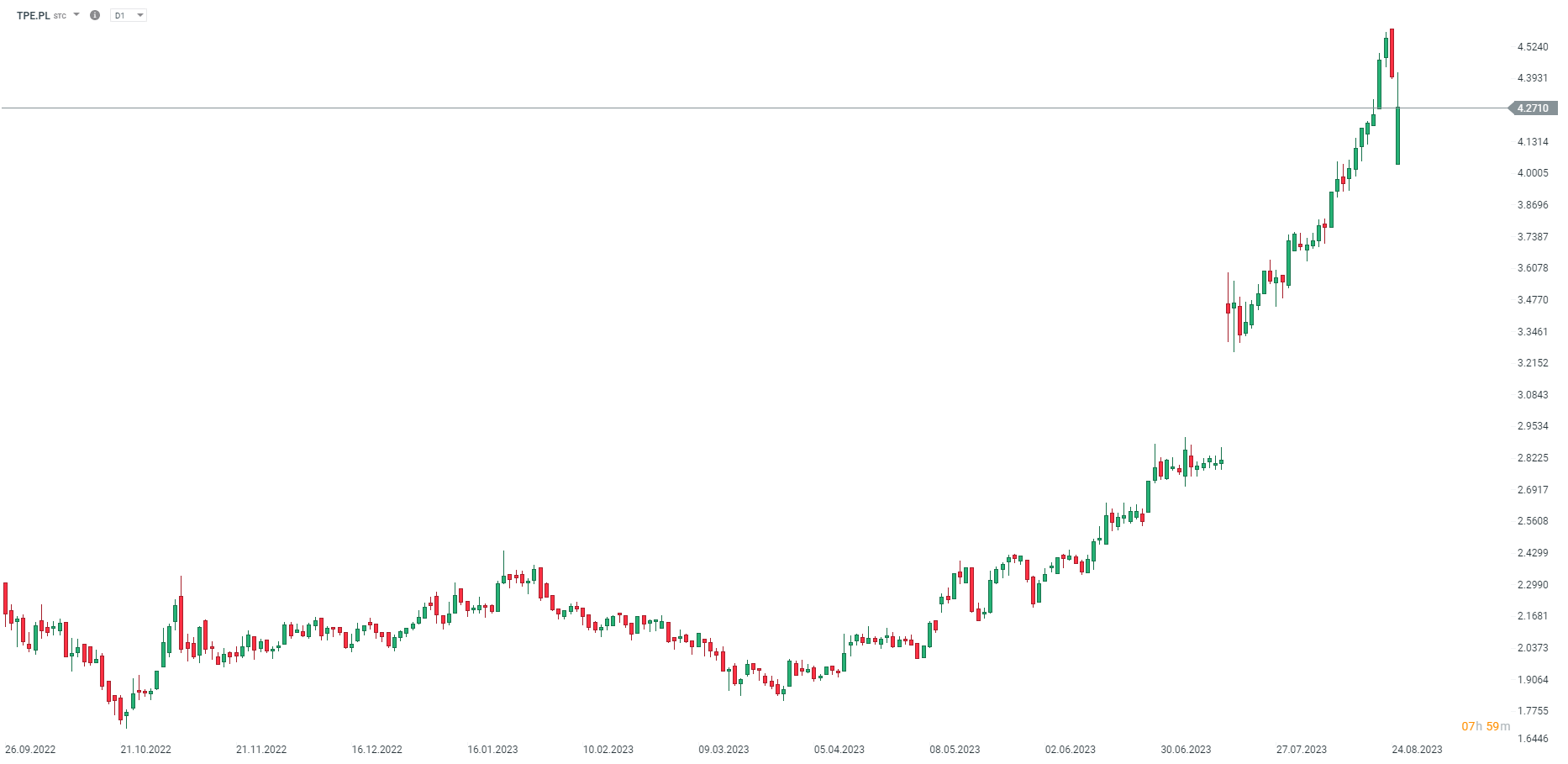 - Tauron opublikował wyniki za H1 na poziomie 840 mln zł (zysk netto). Był to wynik niższy o ponad 100 mln zł względem oczekiwań. Akcje wyraźnie cofały się ze szczytów, najwyższych poziomów od 2015 roku.