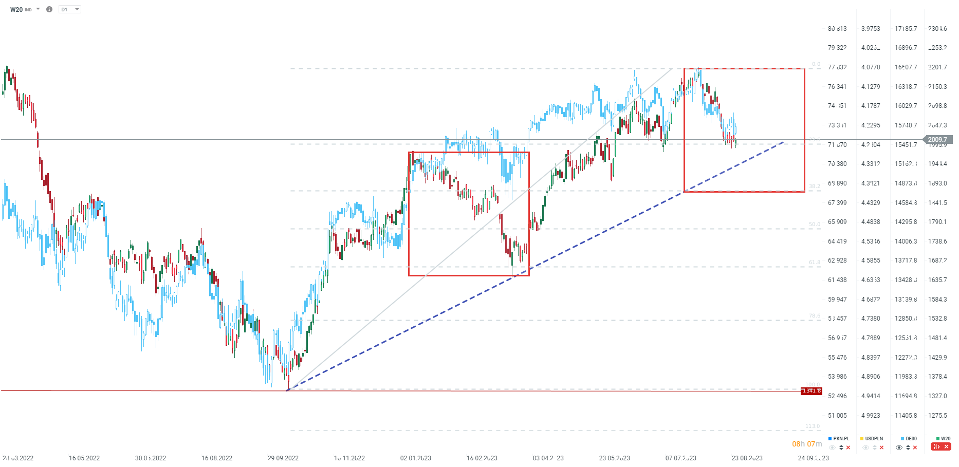 W20 broni ważnego wsparcia w okolicach 2000 punktów i zniesienie 23.6, które znajduje się nieco powyżej wzrostowej linii trendu. Odbiciu pomaga nieco lepsza sytuacja na niemieckim DAXie. Jeśli W20 zamknie się dzisiaj jednak poniżej zniesienia 23.6 to w przyszłym tygodniu może dojść do próby ataku wzrostowej linii trendu. Niemniej warto zauważyć, że zasięg największej korekty w trendzie pozostaje bardzo odległy.