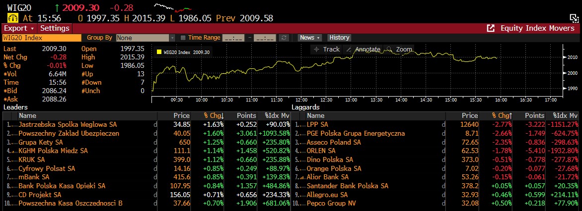 - WIG20 pozostaje blisko wczorajszego zamknięcia