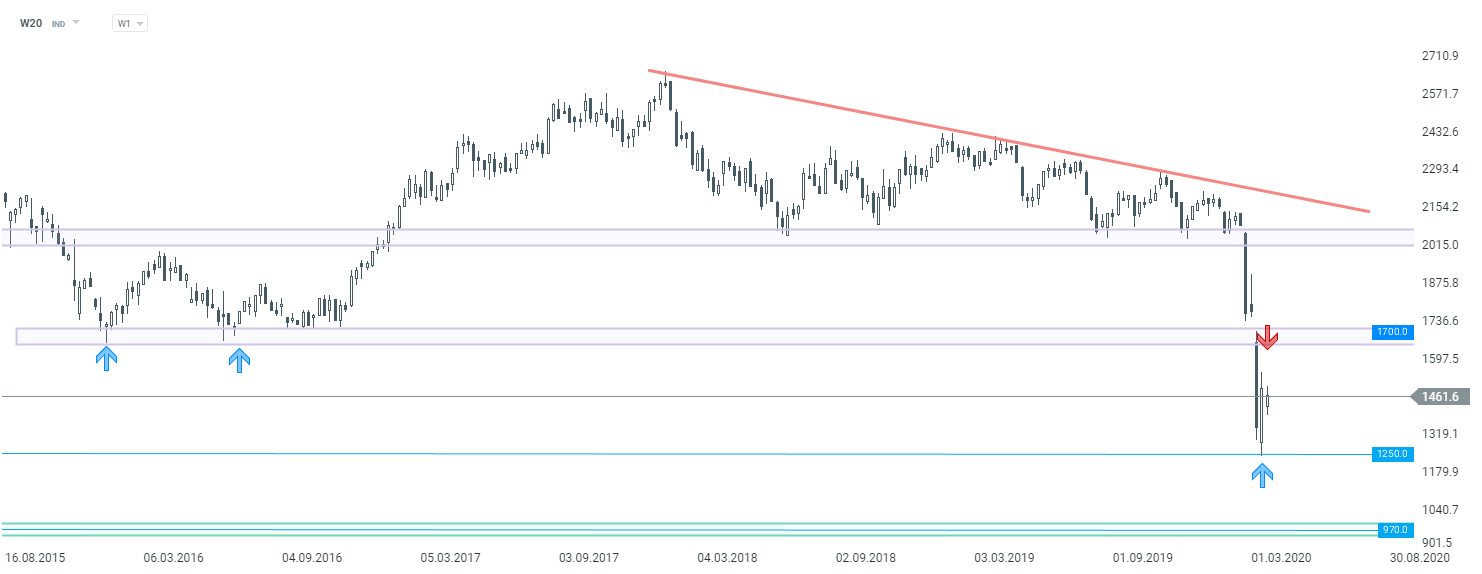 Jeśli chodzi natomiast o sytuację techniczną na indeksie WIG20 (W20), właściwie nie uległa ona większej zmianie. Na interwale D1 notowania utrzymują się w lokalnej konsolidacji, a patrząc na przedział tygodniowy kluczowym wsparciem pozostaje poziom 1250 pkt., gdzie znajdują się ostatnie lokalne minima i dołki z 2009 roku. Aby mówić o większych wzrostach kurs musiałby się trwale utrzymać powyżej poziomu 1700 pkt, do którego cały czas jest dość daleko.
