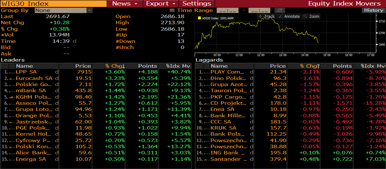 Zestawienie komponentów indeksu WIG30. Większość spółek znajduje się powyżej kreski, a najlepiej radzi sobie LPP (LPP.PL). Źródło: Bloomberg.