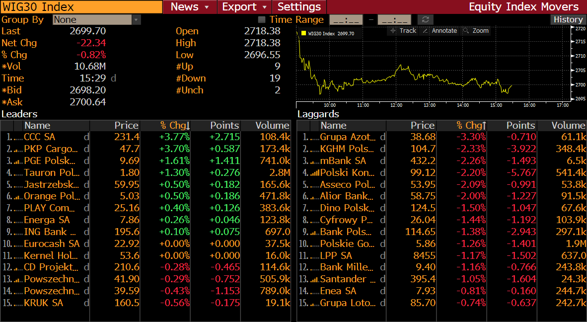 Spółki z indeksu WIG30 o godzinie 15:30. Źródło: Bloomberg