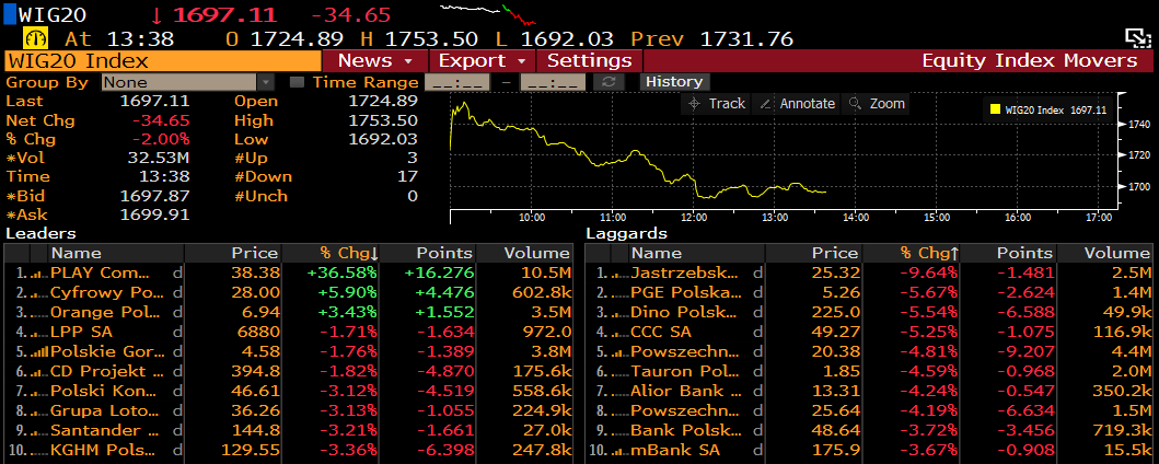 Dzisiaj wiele rynków w Europie pokazuje spadki na poziomie ponad 2%. WIG20 traci nieco niej, choć w tym wypadku jest to powiązane z ogromnym wzrostem cen akcji PLAY (w szczytowym momencie wzrost na poziomie niemal 40%), co jest powiązane z możliwym zakupem dużego pakietu akcji przez francuski podmiot. Oprócz samego Playa, w WIG20 zyskuje jedynie Cyfrowy Polsat oraz Orange, co może być powiązane z nastrojem do sektora.