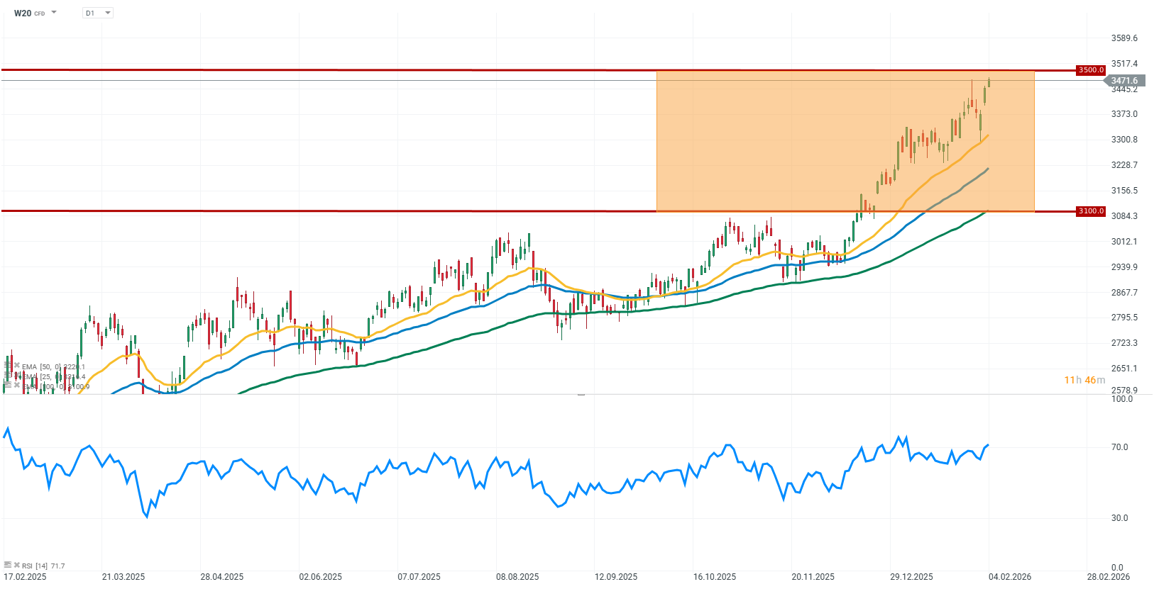 Podczas dzisiejszej sesji kontrakt W20 notuje kolejny wzrost. Dalsz zwyżki napędza pozytywny sentyment związany z prawdopodobną obniżką stóp procentowych na dzisiejszym posiedzeniu RPP. Taka decyzja z pewnością będzie działała pro-wzrostowo i może dodatkowo napędzić notowania kontraktów. Obecnie kontrakty zbliżają się do ważnego poziomu 3500 pkt, którego przełamanie może wymagać właśnie silnego impulsu w postaci decyzji o obniżce stóp.