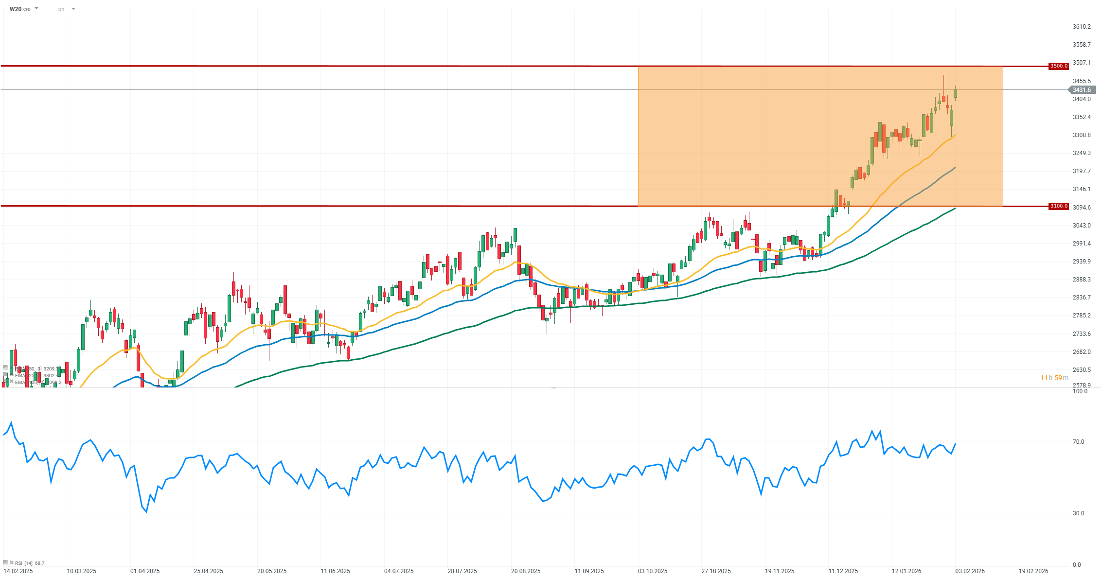 Podczas dzisiejszej sesji notowania kontraktu W20 rosną o ponad 1,5%, co wskazuje na przewagę byków. Cena zbliża się do ważnego oporu na poziomie 3500 punktów, a rosnące średnie kroczące potwierdzają siłę trendu wzrostowego. RSI na poziomie około 68 sugeruje, że jest jeszcze miejsce na dalsze wzrosty, choć rynek zbliża się do strefy wykupienia. Przełamanie oporu 3500 może otworzyć drogę do kolejnych zwyżek
