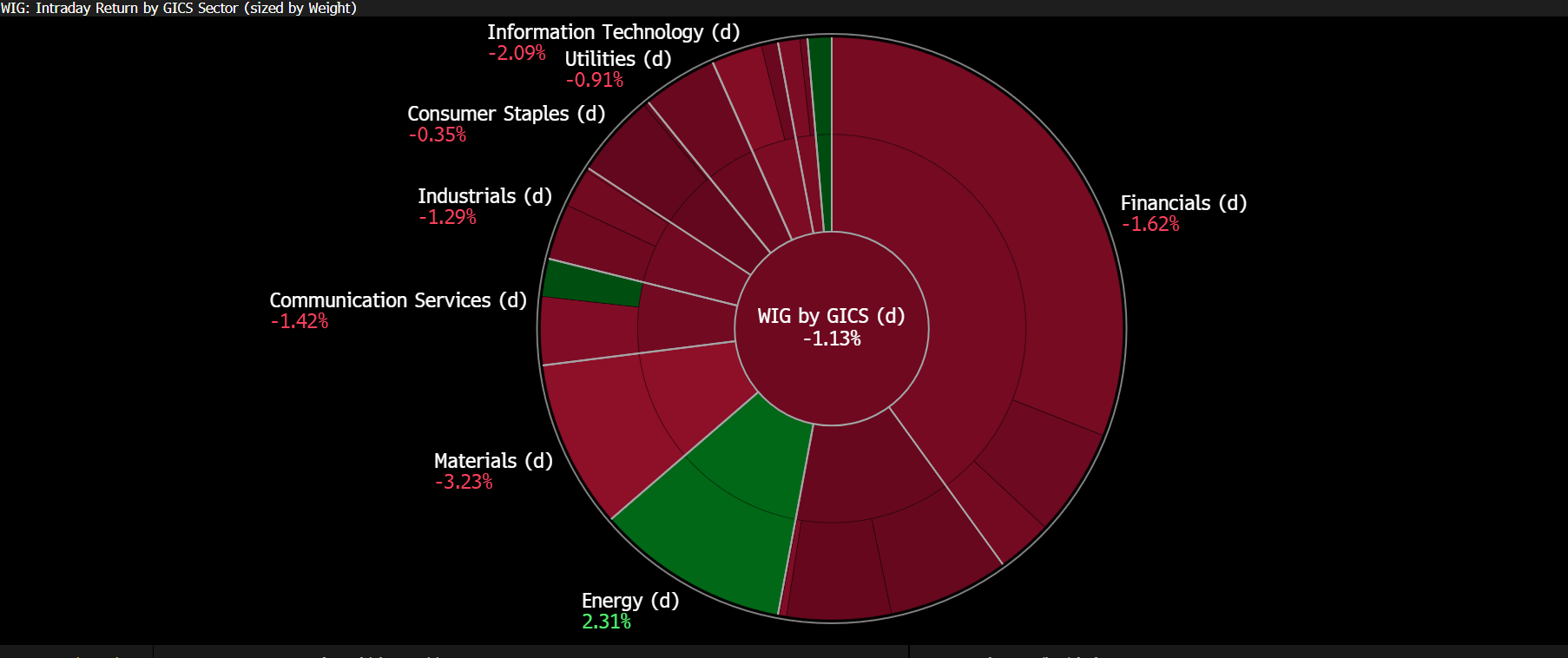Na godzinę 11:30 WIG20 oraz mWIG40 tracą około 1,1%, natomiast sWIG80 spada o jedynie 0,3%.