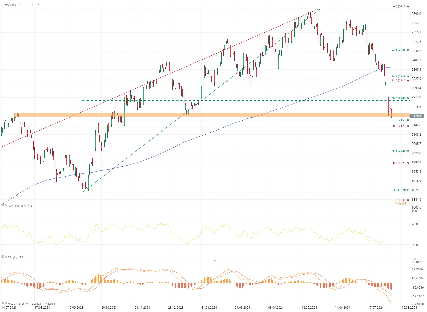 Kontrakt na WIG20 (W20) po wczorajszej sesji i świecy pokazującej niezdecydowanie, podąża za rynkami zachodnimi i spada. Od rana zdążył przebić pierwsze wsparcie na poziomie 2191, czyli szczyt z lipca zeszłego roku. Obecnie wsparcia będzie szukał w okolicach 2174, czyli minimum z tego roku. Po jego przebiciu dwa wsparcia znajdują się na zniesieniacg Fibonacciego dla dwóch różnych okresów, które wynoszą odpowiednio 2153.4 dla 61.8% zniesienia Fibonacciego i 2128.3 dla 38.2% zniesienia Fibonacciego. RSI i MACD kontynuują wyprzedanie, znajdując się na poziomach najniższych od roku. Może to sprzyjać chwilowemu odbiciu, jednak rynek będzie podążał za indeksami zachodnimi. Źródło: xStation