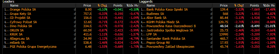 Najlepiej radzi dziś sobie sektor spożywczy, który może być ostatnią defensywą dla inwestorów. Makarony Polskie (MAK.PL) rosną dzisiaj o ponad 1,9%. Sfinks Polska (SFS.PL) wzrasta o ponad 3% próbując opuścić trend spadkowy. PKO (PKO.PL) spada najmocniej ze wszystkich spółek z WIG20 i znajduje się obecnie na poziomach z początku roku.