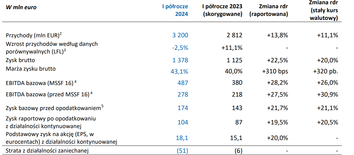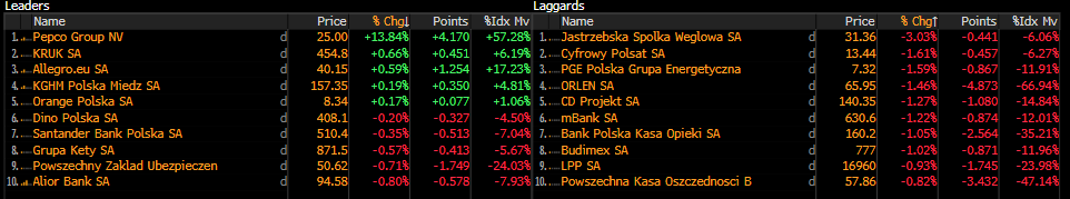 - Pepco (PCO.PL) jest zdecydowanym zwycięzcą początku sesji na polskim rynku. Spółka notuje ponad 10% wzrosty po publikacji raportu za 1 półrocze. Pepco osiągnęło rekordowe przychody w wysokości 3,2 mld euro, co oznacza wzrost o 13% r/r. Co więcej, spółce udało się obniżyć koszty transportu, co w połączeniu z niższymi cenami surowców przyczyniło się do wzrostu marży brutto o 3,1 p.p. do 43,1%. Spółka utrzymuje też wysokie dynamiki wyniku EBITDA (+28% r/r), a także zysku netto przypadającego na jedną akcję (+20% r/r). Wyniki spółka zawdzięcza przede wszystkim mocnemu rozwojowi nowych sklepów, bowiem w ujęciu sprzedaży porównywalnej zanotowała on spadek -2,5% r/r.