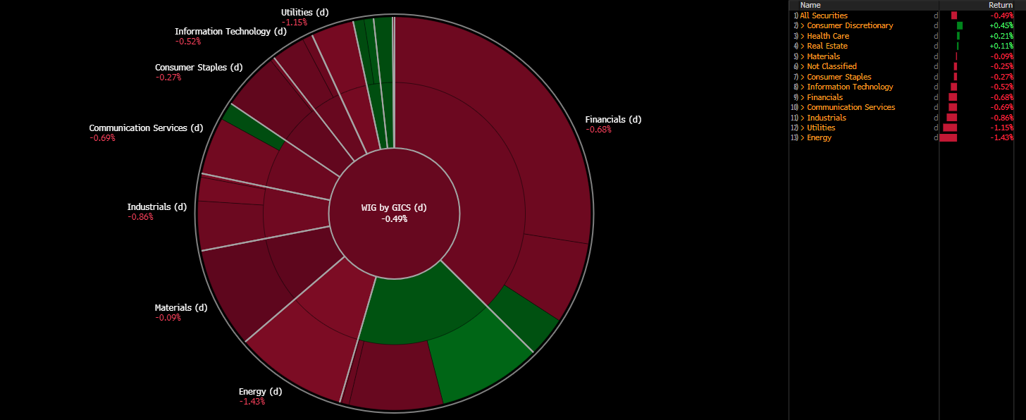 Na polskim rynku widzimy dziś spadki. Najgorzej radzi sobie sWIG80, który traci 0,5%. Podobnie radzi sobie szeroki rynek, który traci 0,49%. Na polskim rynku najmocniej traci sektor energetyczny (-1,43%), a także mocno z nim związany sektor usług użyteczności publicznej (-1,15%). Jedyne wzrosty możemy zauważyć w obszarze sprzedaży dóbr konsumenckich, dzięki mocnym wynikom Pepco.