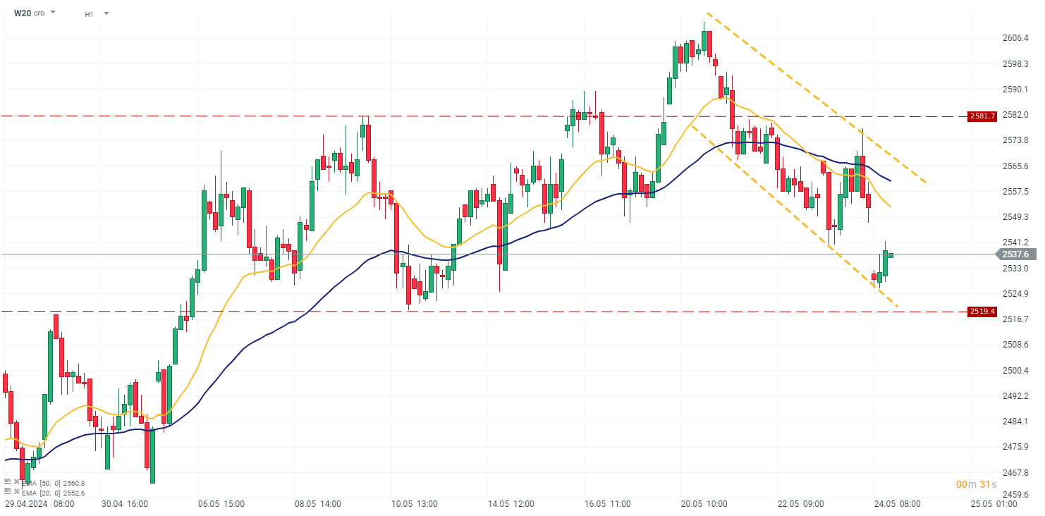 W ujęciu 1H kontrakt na indeks WIG20 (W20) znajduje się od początku tygodnia w trendzie spadkowym. Nie widać jednak na razie powodów do uważania, że trend ten będzie umocniony i zepchnie notowania kontraktu do minimów z kwietnia. Nastroje rynkowe wskazują bardziej na zamknięcie indeksu w korytarzu ograniczanym od dołu minimami z maja na poziomie 2519,4 pkt., a od góry oporem w okolicach 2581,7 pkt. Przebicie tego oporu z początku tygodnie nie okazało się trwałe, a od tamtej pory notowania zawracają. W przypadku zejścia notowań poniżej ograniczeń korytarza inwestorzy mogą spodziewać się umocnienia spadkowego trendu zmierzającego w kierunku 2459 pkt., wyznaczonych kwietniowymi poziomami. Źródło: xStation
