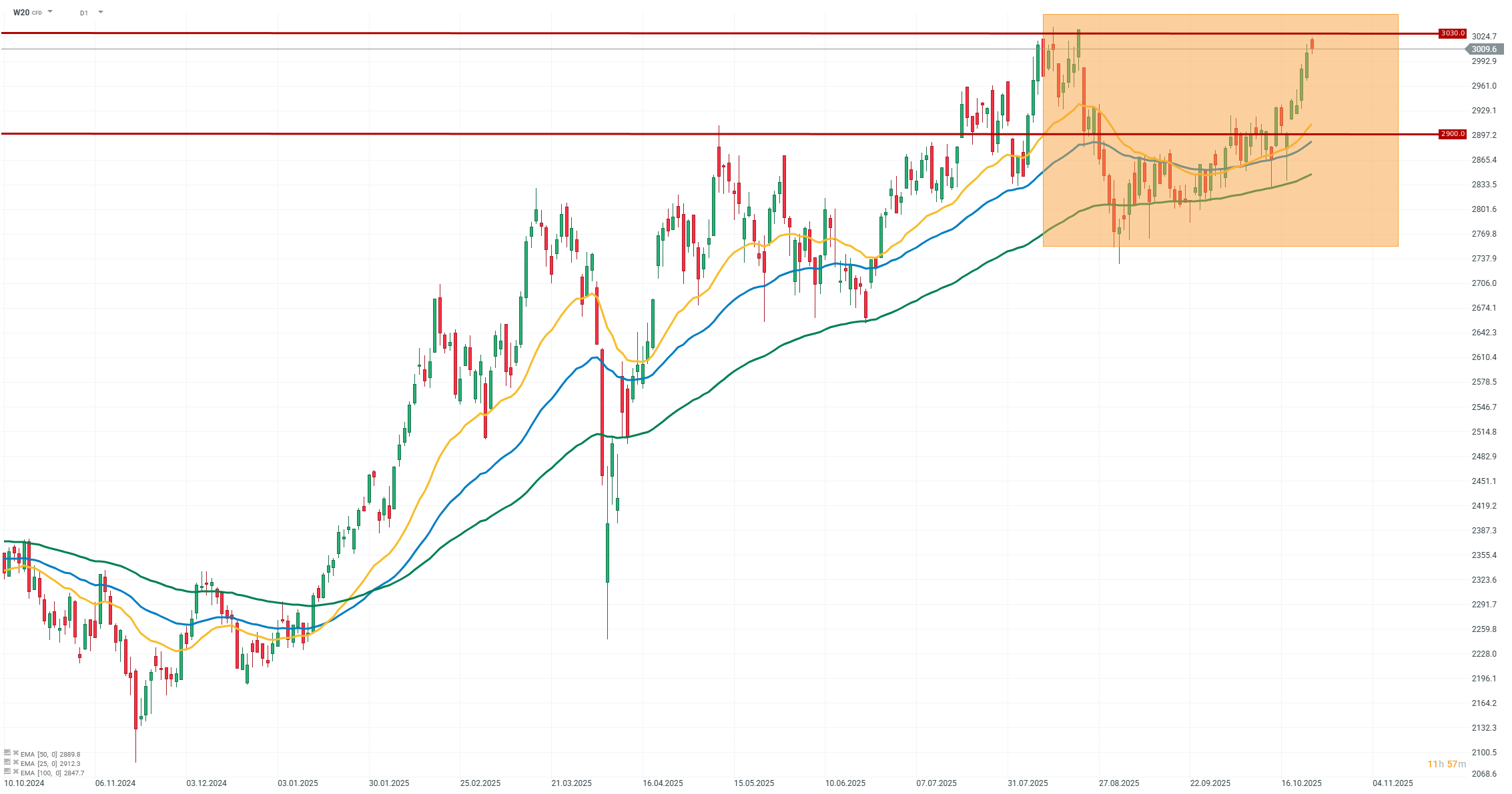 Notowania kontraktów na indeks WIG20 ponownie przekroczyły psychologiczną barierę 3000 pkt, co świadczy o utrzymującej się przewadze kupujących. Ruch ten wspierają korzystne dane makroekonomiczne oraz pozytywny sentyment na rynku, które zwiększają apetyt inwestorów na ryzyko i sprzyjają wybiciu z trwającej od kilku tygodni konsolidacji. Na wykresie dziennym widać, że indeks przez dłuższy czas poruszał się w przedziale 2950–3030 pkt, tworząc bazę pod dalszy ruch w górę. Dolne ograniczenie przy 2950 pkt stanowiło istotne wsparcie techniczne, natomiast okolice 3030 pkt wyznaczają kluczową strefę oporu, której trwałe przełamanie może otworzyć drogę do dalszych wzrostów w rejonie 3100–3120 pkt.