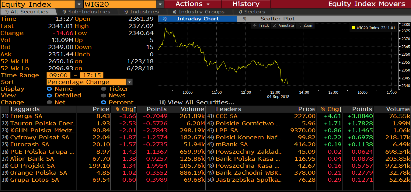 Większość spółek w segmencie blue chipów znajduje się pod kreską. Już za niespełna godzinę do gry wejdzie również kapitał amerykański po dniu przerwy, co może spowodować większe ruchy w końcówce sesji. Źródło: Bloomberg.