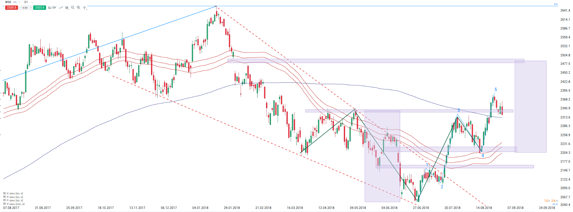 Na wykresie dziennym indeks WIG20 (W20 na xStation5) w dalszym ciągu pozostaje w obszarze wsparcia powyżej 2310-2340 pkt. W tych rejonach znajdują się lokalne szczyty z poprzednich miesięcy oraz średnia 200-sesyjna, która wcześniej stanowiła opór dla notowań polskiego benchmarku. Warto zwrócić uwagę, że od dołka z lipca wzrosty przyjęły formę 5-falowej struktury, co sugeruje możliwość większej korekty w najbliższych tygodniach. Nasz parkiet pomimo ostatniej relatywnej siły z pewnością będzie pozostawać pod wpływem zagranicznych parkietów, które w ostatnich dniach stają pod groźbą korekty (w szczególności Europa, kiedy wzrosty na Wall Street się zakończą).