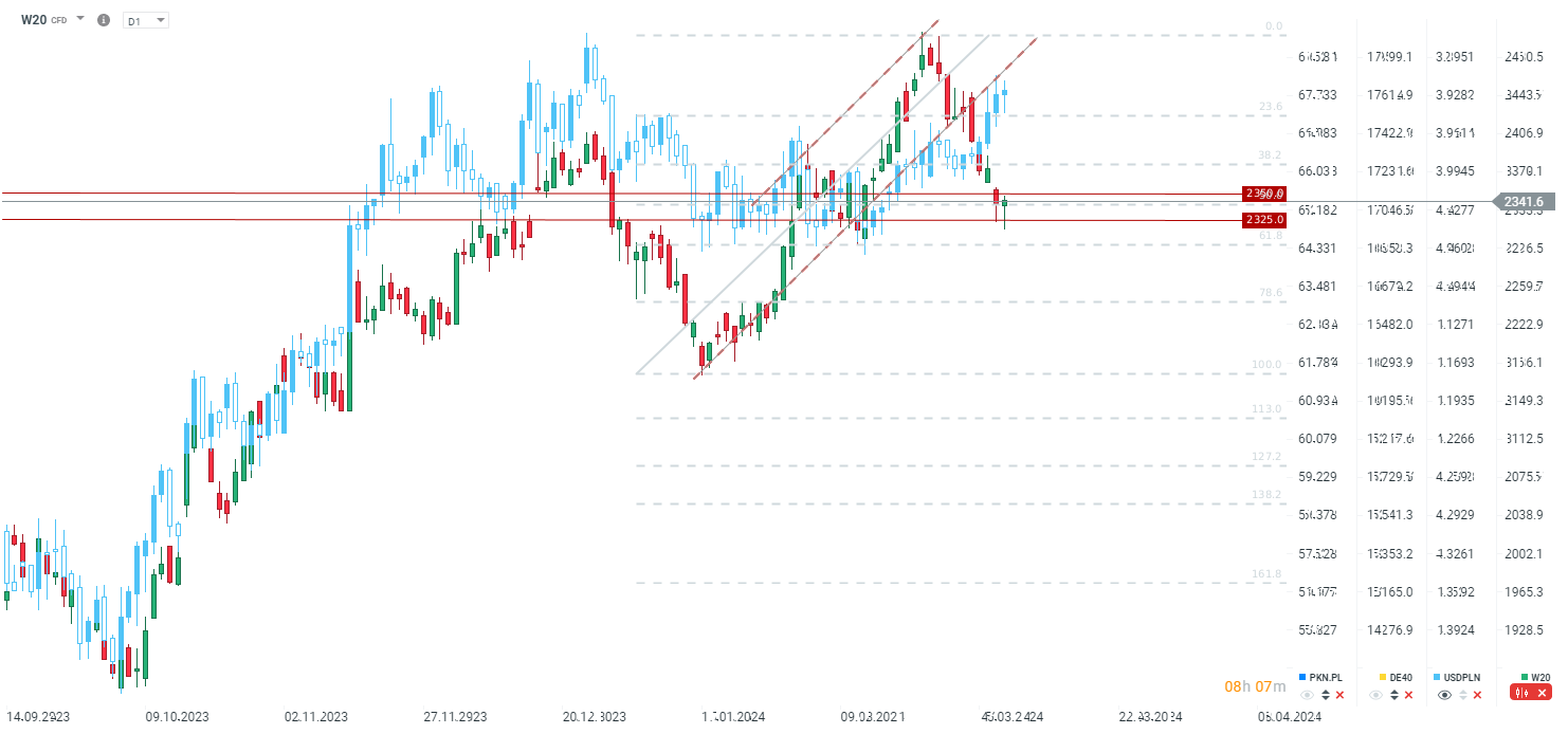 W20 wykazuje oznaki optymizmu, odbijając się z okolic 2325 punktów i powracając powyżej zniesienia 50.0. Jeśli kontrakt na indeks zamknie się powyżej zniesienia 50.0, odrabianie strat może być kontynuowane. Kolejnym celem będzie luka na 2360 oraz następnie zniesienie 38.2 przy 2377.