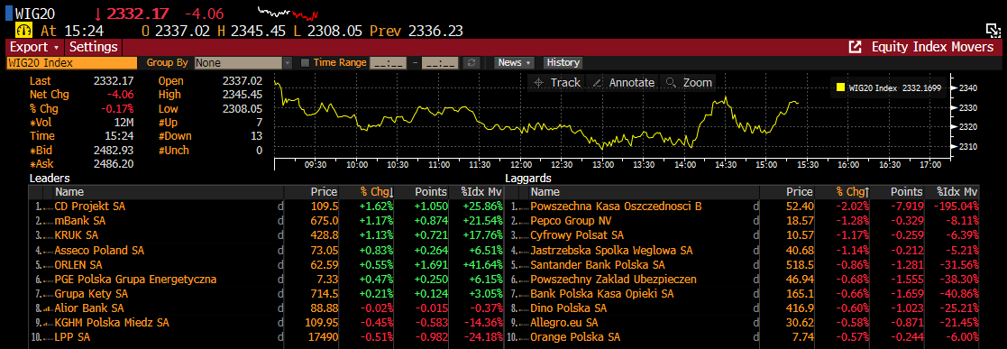 PKO jest nie tylko najsłabszym bankiem w WIG20, ale rówież najsłabszym bankiem w subindeksie bankowym w Stoxx 600. CD Projekt pokazuje wyraźne sygnały odwrotu trendu. Czy koniec gamingowej bessy jest już bliski? Źródło: Bloomberg