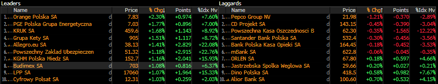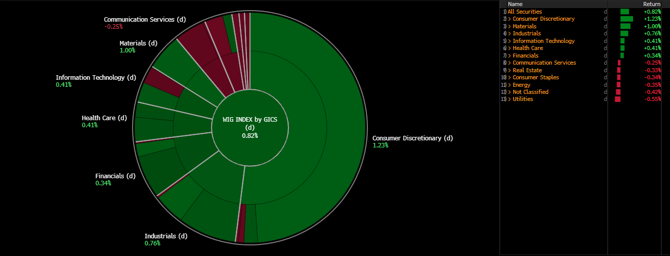 Polski rynek kontynuuje z początku tygodnia. Najlepiej radzi sobie dziś szeroki indeks WIG, który rośnie dziś o 0,8%. Wczorajsze wzrosty banków dziś wyhamowały, a indeks WIG-Banki pozostaje na poziomach z wczorajszego zamknięcia. Za to inne instytucje finansowe wypychają sektor finansowy do wzrostu w wysokości 0,3%. Spośród sektora najlepiej radzą sobie dobra konsumenckie, wśród których w szczególności pozytywnie wyróżnia się WIG-Odzież z 1,5% wzrostem. Najmocniej w sektorze odbija CCC (+2,8%), które wczoraj zanotowało korektę o ponad 7%.