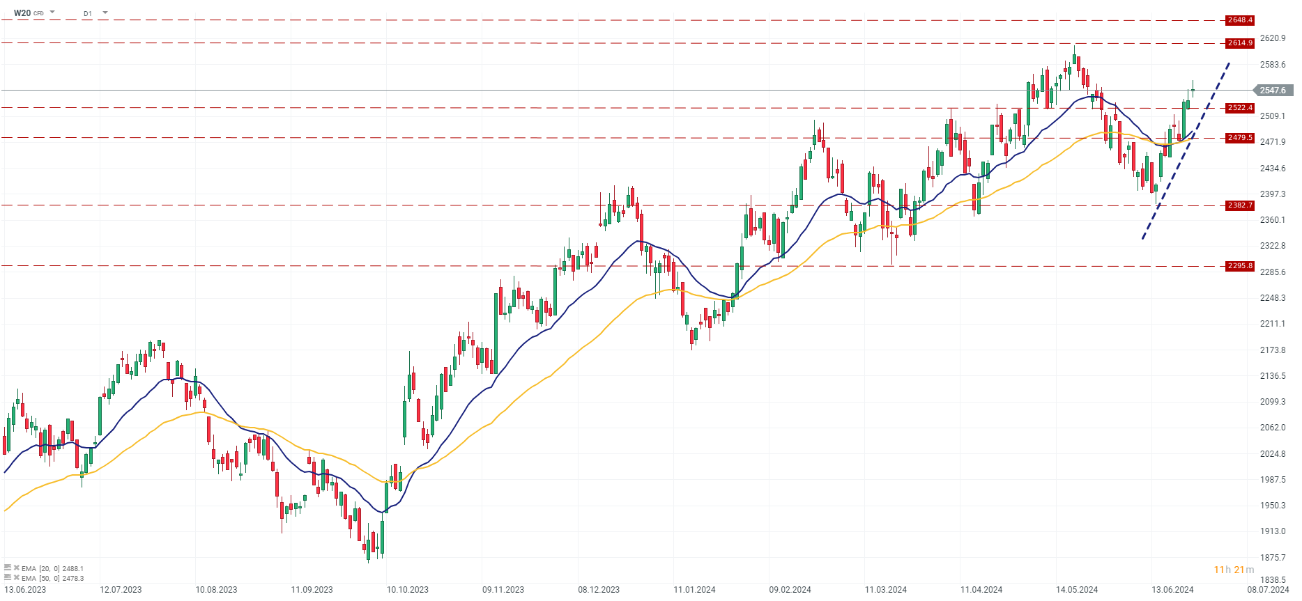 Kontrakt na WIG20 (W20) umacnia swoje wzrosty od początku tygodnia. Dzisiejsza sesja wzmacnia wczorajsze przebicie poziomu 2522 pkt, któy stanowił istotny opór notowań z pierwszego kwartału. Dodatkowo, dzisiejsza sesja umacnia przecięcie wykładniczych średnich kroczących (EMA20 i EMA50), co stanowi byczy sygnał dla dalszych kierunków notowań indeksu. Po wzrostach z ostatnich dni wraz z osłabieniem tempa dynamiki sektora finansowego możemy się spodziewać niewielkiej korekty w krótkim terminie. Jeżeli jej zasięg zatrzyma się powyżej 2522 pkt. to byki będą mogły kierować swój wzrok w stronę lokalnych szczytów w okolicach 2614 pkt. Ewentualne cofnięcie notowań może popchnąć kontrakt w kireunku 2479,5 pkt, które stanowi wsparcie przed ewentualnym odwrotem do lokalnych minimów. Źródło: xStation