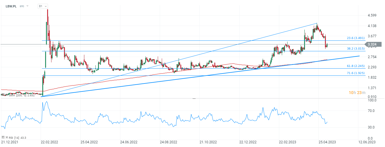 Alcje Lubawy (LBW.PL), interwał D1. Pomimo ostatnich dynamicznych spadków, akcje znajdują się w trendzie wzrostowym. Linia trendu pokrywa się mniej więcej z SMA200, w okolicach 2,6 PLN. Kluczowym poziomem wsparcia wydaje się 3 PLN, gdzie widzimy 38,2 zniesienie Fibonacciego fali wzrostowej z 24 lutego 2022 roku. Najbliższy opór możemy odnaleźć przy 3,5 PLN za walor, gdzie adekwatnie widzimy 23,6 zniesienie Fibo. Źródło: xStation5