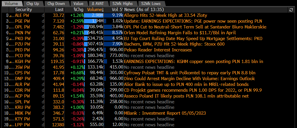 Aktywność akcji poszczególnych walorów z WIG20. Źródło: Bloomberg