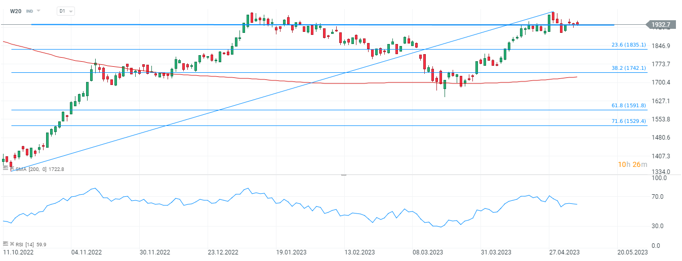 W20 utrzymuje wzrostowe momentum jednak patrząc na układ świecowy widzimy, że podaż dochodzi do głosu. Jeśli ostatnie odbicie zostanie wymazane prawdopodobny wydaje sie test 23,6 zniesienia Fibonacciego przy 1835 pkt. Źródło: xStation5