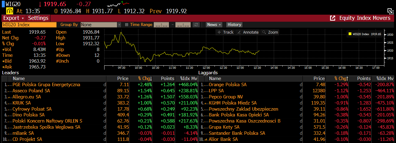 - Wśród spółek z WIG20 najmocniej zyskuje dziś PGE (PGE.PL) i Asseco Poland (ASE.PL), firma ostatnio opublikowała szacunki zysku netto, które pobiły oczekiwania