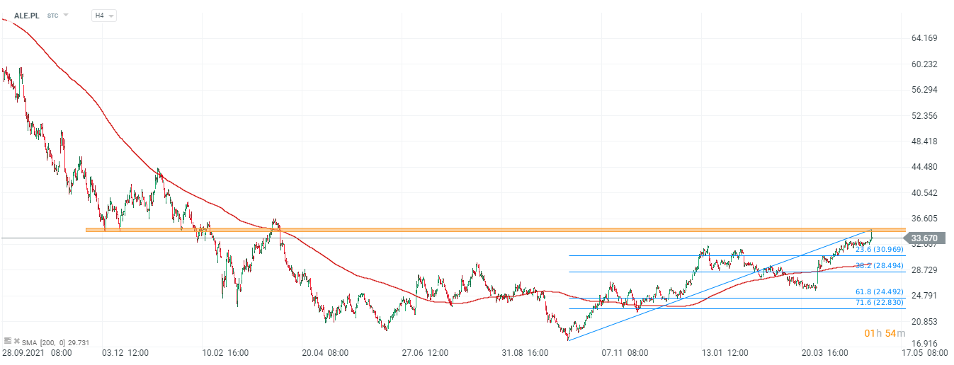Akcje Allegro, interwał D1. Walory weszły w istotną strefę z punktu widzenia podaży, wyznaczoną poprzednimi reakcjami cenowymi. Popyt został szybko ostudzony po wybiciu 35 PLN za akcję, jednak w razie próby ponownego ataku pokonanie tej strefy może otworzyć drogę nawet do 45 PLN gdzie widzimy lokalne szczyty ze stycznia 2022. Poziomy Fibonacciego wyznaczają pierwszę strefę wsparcia przy 31 PLN za walor. Źródło: xStation5