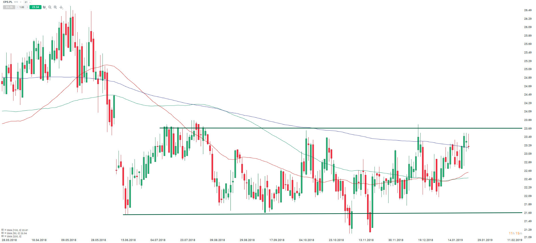 Cyfrowy Polsat (CPS.PL) pozostaje w konsolidacji od połowy 2018 roku, jednak teraz notowania zbliżają się do jego górnego ograniczenia. Źródło: xStation5.