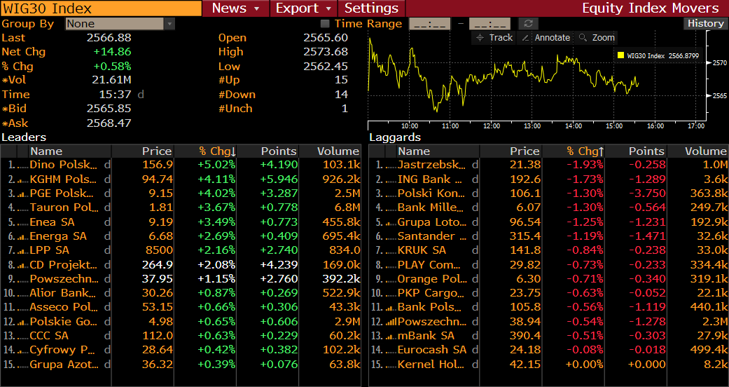 Podczas dzisiejszej sesji możemy ponownie obserwować lepsze nastroje na rynku akcji. Wzrosty pojawiły się w momencie podania przez Bloomberga informacji jakoby USA i Chiny zgodziły się na stopniowe wycofywanie się z ceł. Jest to więc kolejna kolejna pozytywna wiadomośc w sprawie toczącej się wojny handlowej między dwiema największymi światowymi gospodarkami. Tym samym od godzin porannych na światowych parkietach możemy obserwować kontynuację wzrostów. Podczas gdy indeksy w USA wybijają kolejne historyczne szczyty, a niemiecki DAX znajduje się na najwyższych poziomach w tym roku, polska giełda pozostaje nieco w tyle. Przed godziną 17:00 indeks dwudziestu największych spółek znajduje się na plusie wynoszącym 0,7%. Najlepiej radzą sobie dziś Dino Polska, KGHM i PGE. Z kolei spore spadki możemy obserwować na JSW i Lotosie.