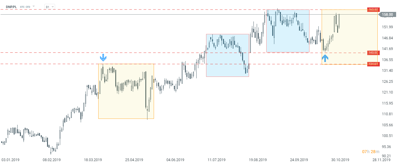 Najlepiej radzącą sobie dziś spółką jest Dino Polska, przed godziną 17:00 notowania znajdują się na plusie przekraczającym 5%. Patrząc technicznie na wykres, w ostatnim czasie doszło do obrony lokalnego układu 1:1 (zaznaczonego niebieskimi prostokątami), co wywindowało notowania w okolice historycznych szczytów. Trend pozostaje wzrostowy i na razie nie widać sygnałów do jego odwrócenia. Gdyby jednak pojawiła się jakaś reakcja podażowa, najbliższym wsparciem jest dopiero poziom 140,00 zł, a anstęnie 134,6 zł.