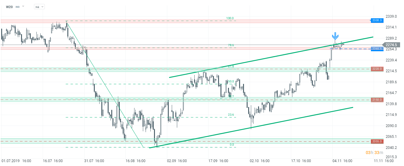 Patrząc na sytuację techniczną na W20, rynek ponownie znalazł się na wysokości górnego ograniczenia kanału wzrostowego, tym samym notowania utrzymują się powyżej strefy przy 2265 pkt. Jeżeli dojdzie do pokonania zielonej linii, to wzrosty mogą przyspieszyć, wtedy też należy oczekiwać ruchu w kierunku poziomu 2330, który jest najbliższym kluczowym oporem. Aby myśleć o spadkach kurs musiałby wrócić z powrotem poniżej wspomnianego wsparcia przy 2265 pkt, wtedy też istniały szansa na większa kroektę spadkową i ruch w kierunku 2220 pkt.