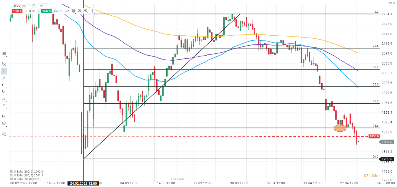 Wykres notowań indeksu W20, interwał H4. Piątkowa sesja przyniosła kolejny impuls spadkowy polskiego indeksu blue chipów, który swoim zasięgiem wybił się powyżej wcześniej wspominane wsparcie na poziomie 1856 punktów. Spadek ten, z technicznego punktu widzenia otworzył drogę rynkowym niedźwiedziom to wznowienia spadków w rejony 1790 punktów, gdzie znajduje się tegoroczne minimum. Za najbliższy poziom oporu uchodzi w chwili obecnej wcześniej wspomniany poziom 1856 punktów (czerwona, przerywana linia). Źródło: xStation 5