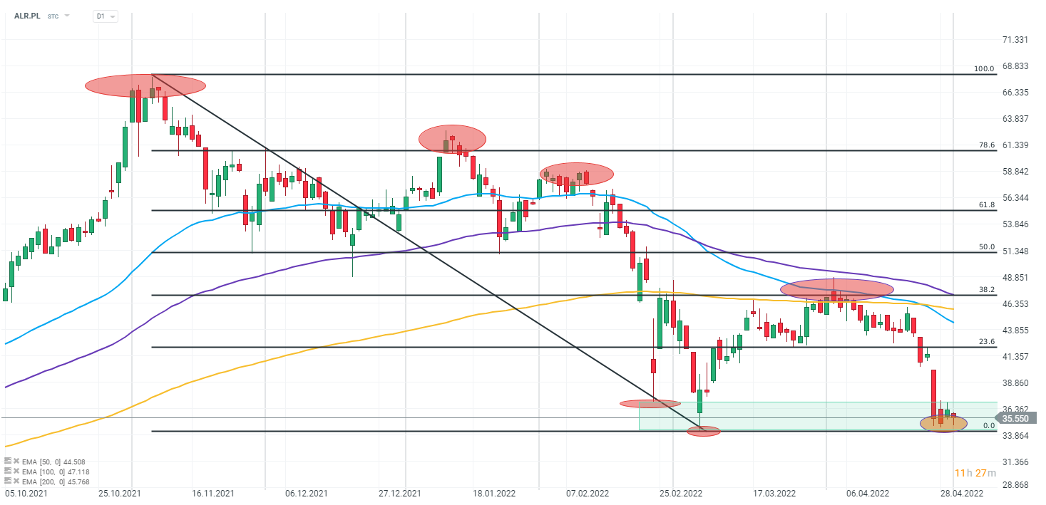 Wykres notowań walorów Alior Bank (ALR.PL), interwał D1. Z punktu widzenia analizy wykresu, notowania znajdują się w chwili obecnej w strefie, która wcześniej służyła jako miejsce aktywizacji strony popytu. Warto jednak zwrócić uwagę, że obserwowane wcześniej wybicie nie zanegowało trwającego trendu spadkowego. Jeśli kurs zdoła utrzymać się ponad poziomem 34,25 zł za akcję, może zachęcić to do odreagowania spadków w rejon 40 zł za akcję. Potwierdzone przebicie wcześniej wspomnianej strefy zachęci jednak sprzedających do dalszych zniżek. Kluczowym wydaje się również dalsza trajektoria zmian w obrębie obsługi kredytobiorców w Polsce, na które sektor bankowy silnie reaguje. Źródło: xStation 5