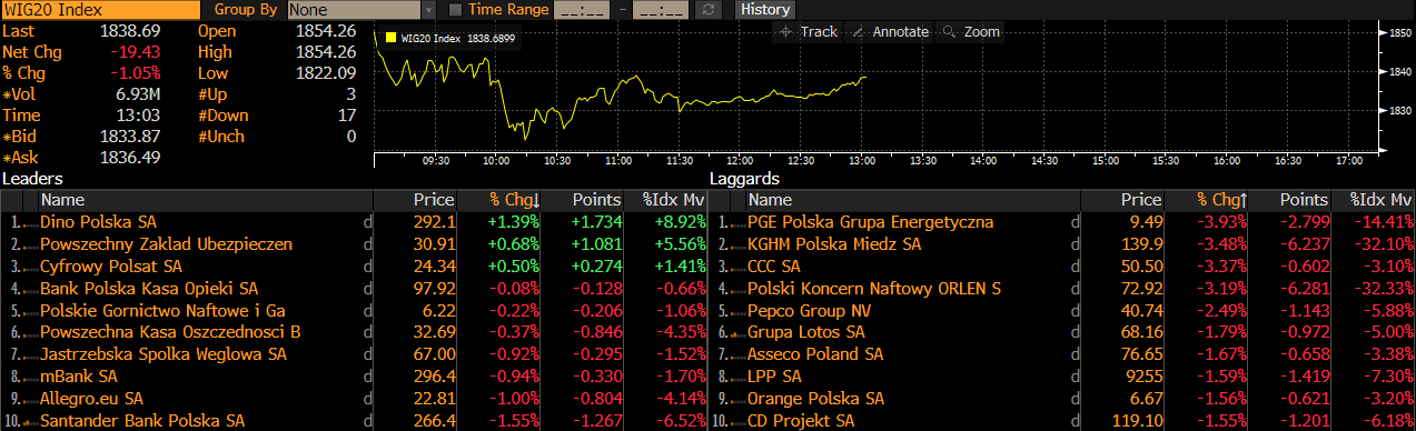 Spółki wchodzące w skład indeksu WIG20 (W20) i ich największe zmiany procentowe w ujęciu dziennym. Źródło: Bloomberg