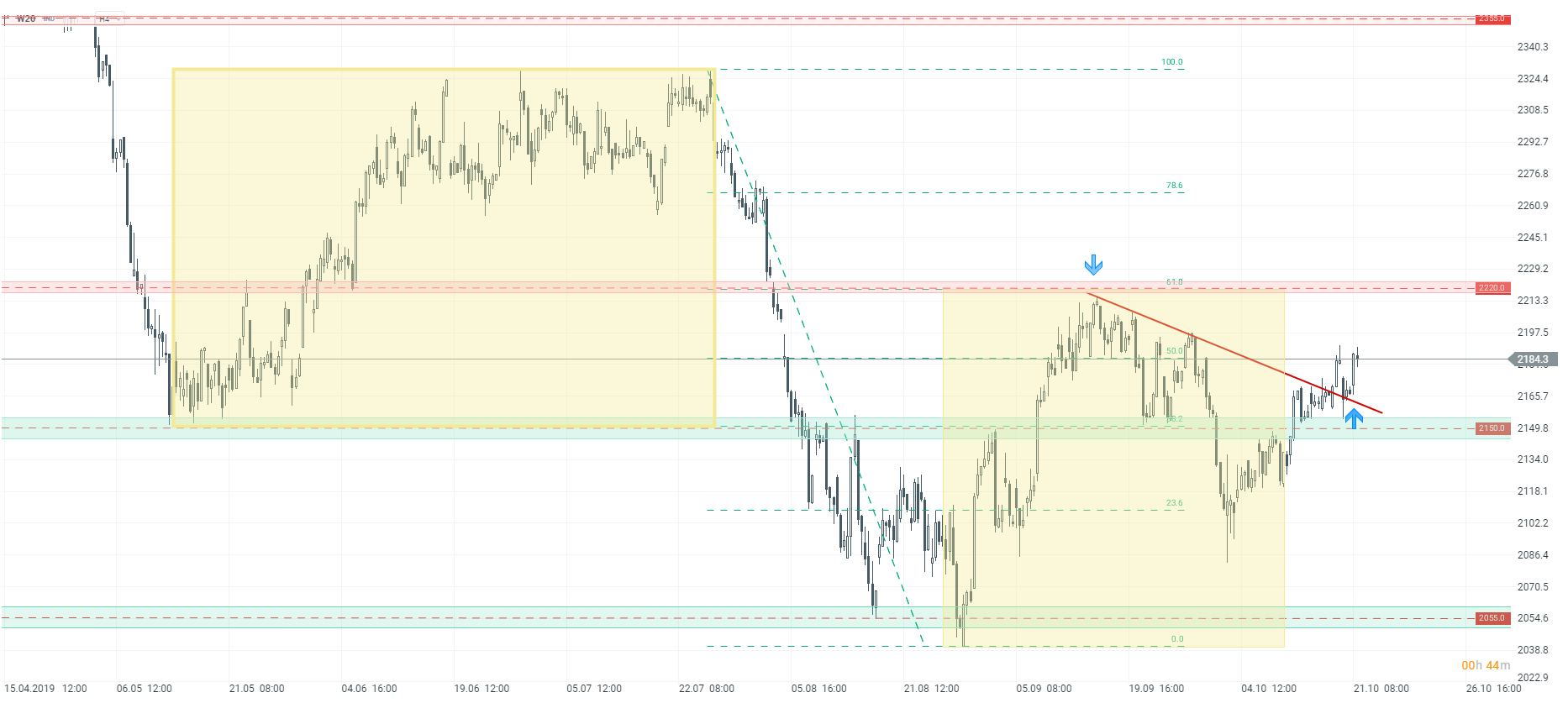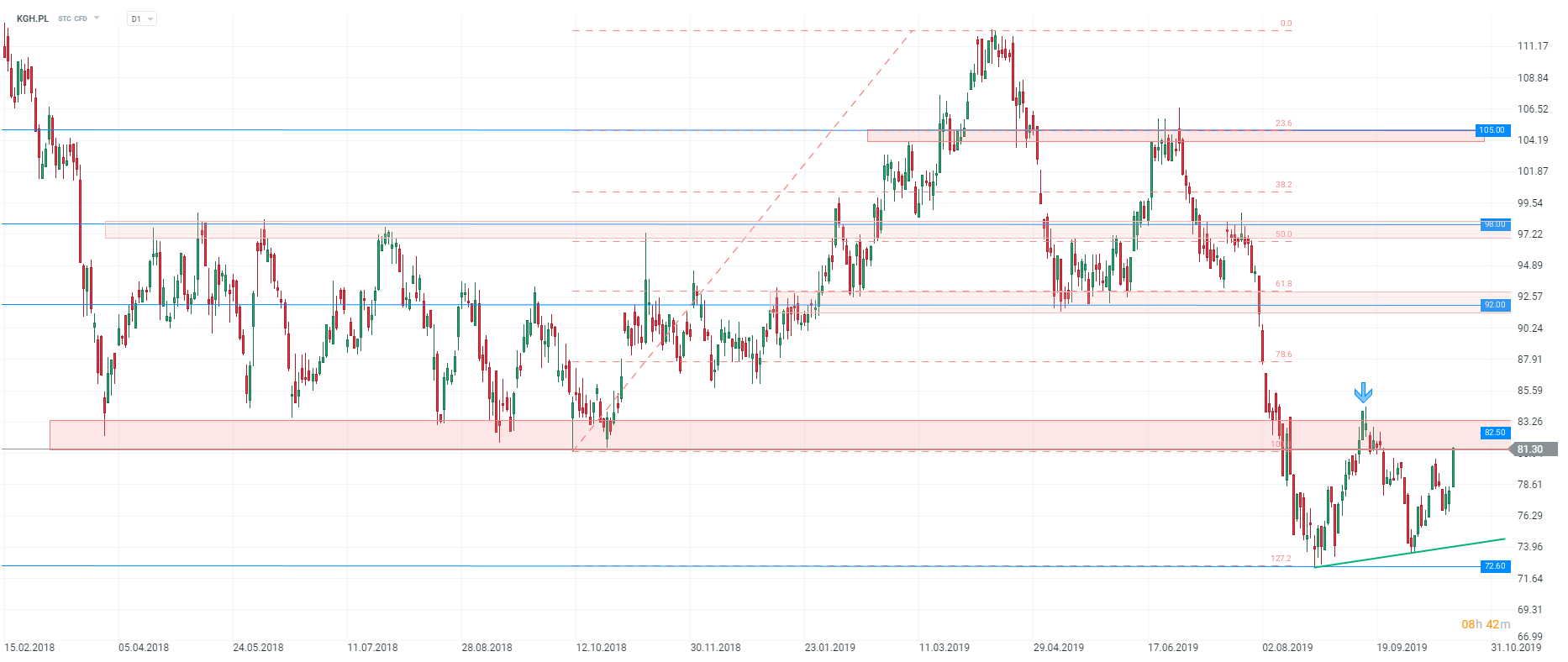 Podczas dzisiejszej sesji możemy obserwować wyraźne wzrosty na KGHM (KGH.PL), po godzinie 15 spółka rośnie blisko 4%, tym samym doszło do testu kluczowej strefy oporowej. Patrząc na wykres o interwale D1, cena po raz kolejny dotarła do strefy przy poziomie 82,5 zł. W tym miejscu rynek dynamicznie zawrócił w połowie września. Niemniej spadki nie zdołały wybić nowych minimów, co może się aktualnie przekładać na formację lokalnego podwójnego dna. Jeżeli wspomniana strefa oporowa zostanie wybita, będzie to jednoznaczne z wybicie linii szyi, a to z klasycznej analizy technicznej może zapowiadać odwrócenie trendu. Na razie jednak kurs znajduje się dopiero przy dolnym ograniczeniu strefy, a miejsce to może być wykorzystywane przez sprzedających. Dopóki cena znajduje się poniżej, trend pozostaje spadkowy. W dzisiejszym komunikacie spółki możemy przeczytać, że sprzedaż okazała się lepsza od rynkowych oczekiwań. Cytat z raportu: "Sprzedaż miedzi płatnej wyniosła 67,5 tys. ton i była wyższa o 7 tys. ton (+12%) w porównaniu do sprzedaży miedzi z września 2018 roku. Głównym powodem była wyższa sprzedaż tego metalu zrealizowana przez KGHM Polska Miedź S.A., choć pozostałe aktywa produkcyjne we wrześniu tego roku również wykazały lepsze wyniki sprzedażowe".