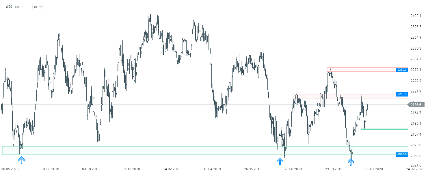 W20 zbliża się do strefy oporowej przy 2215 pkt. Źródło: xStation5