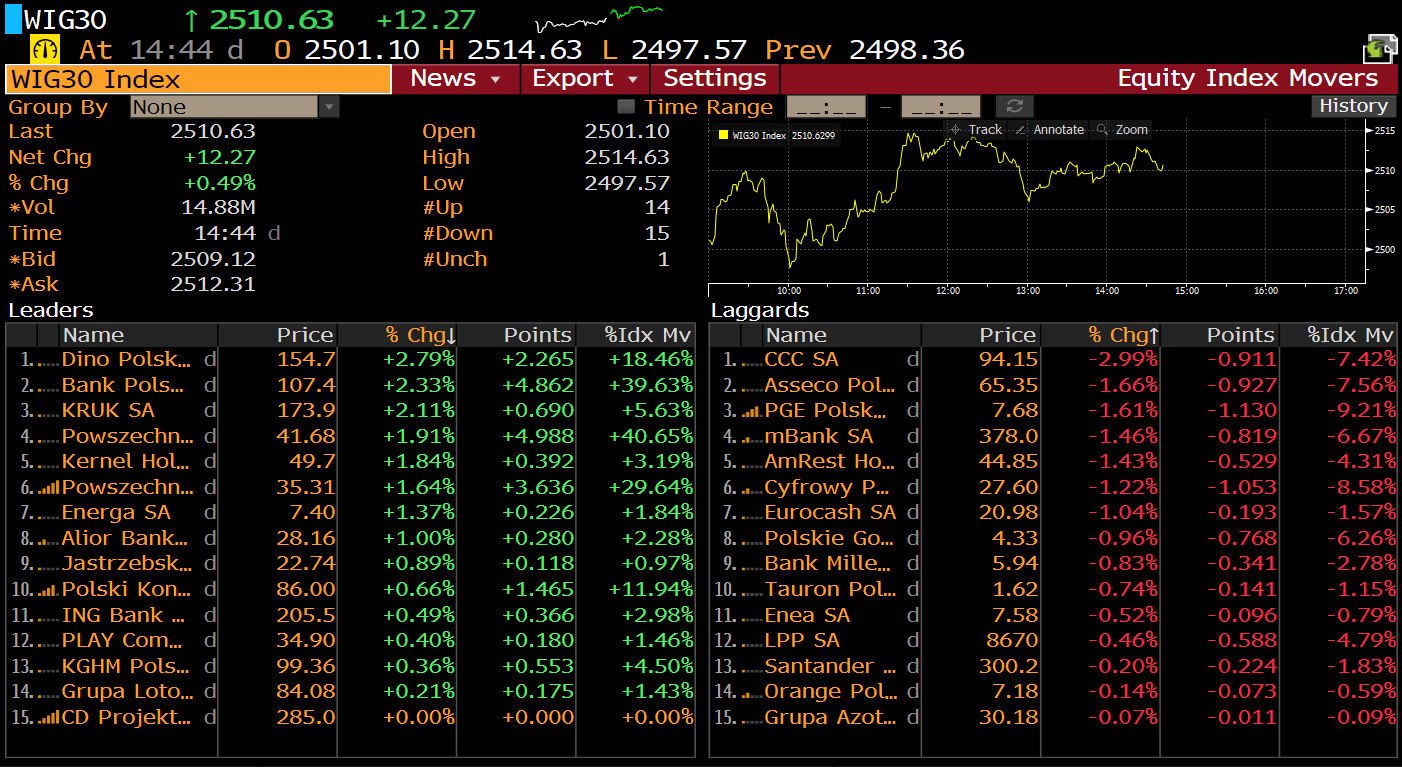 Spółki z WIG30 przed godziną 15:00. Źródło: Bloomberg