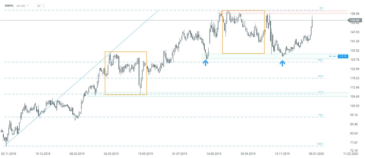 Patrząc na poszczególne spółki, na uwagę zasługuje Dino Polska, która przewodzi w WIG20. Wzrosty w pewnej chwili wynosiły ponad 5%, jednak aktualnie zostały zniwelowane do nieco ponad 3%. Niemniej i tak Dino pozostaje liderem wśród blue chipów. Ruch z jakim mamy dziś do czynienia nie został wywołany żadną informacją płynącą ze spółki. Patrząc technicznie na wykres, mamy do czynienia z kontynuacją trendu wzrostowego. W ostatnim czasie rynek odbił od kluczowej strefy wsparcia, zlokalizowanej w rejonach poziomu 132 zł, o czym wspominaliśmy w jednym z ostatnich artykułów z cyklu Puls GPW. Zgodnie z metodologią, obrona dolnego ograniczenia układu Overbalance świadczy o kontynuacji trendu, dlatego też w niedalekiej przyszłości powinniśmy zobaczyć atak na strefę oporową przy 160 zł. Jej pokonanie może przyczynić się do przyspieszenia wzrostów.