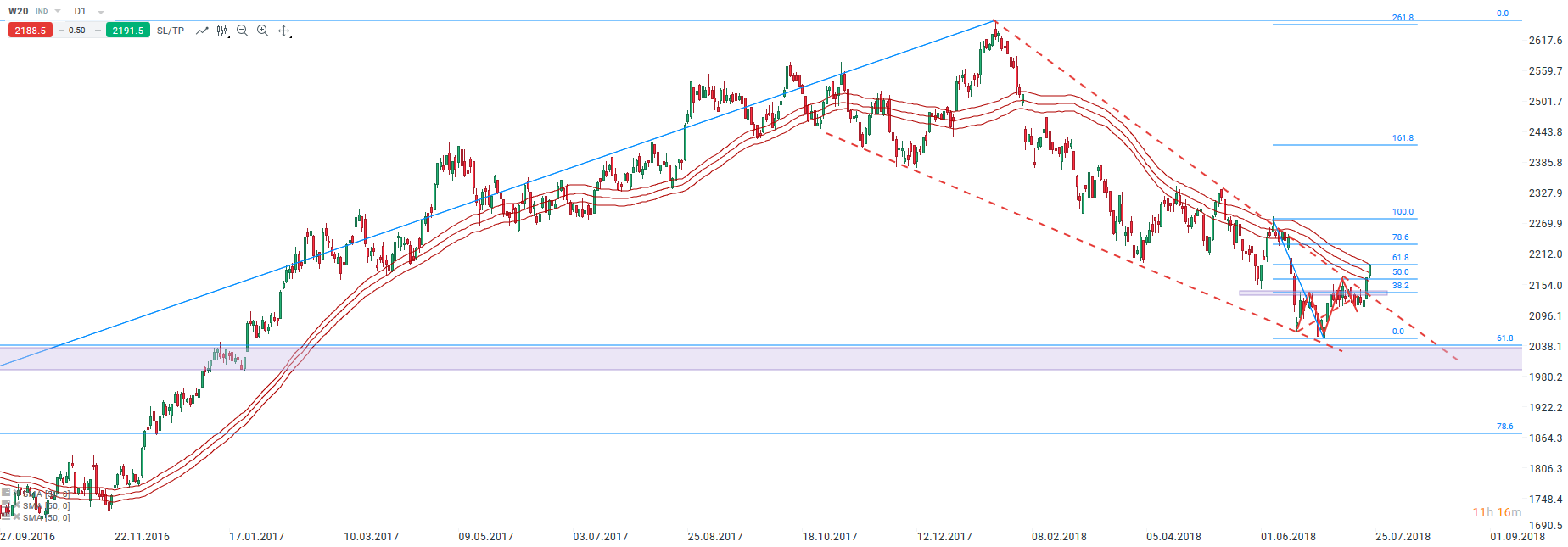 Ostatnia relatywnie silna postawa naszego największego indeksu może mieć techniczne podstawy. Notowania indeksu W20 w ostatnich miesiącach pozostawały w obrębie formacji klina zniżkującego. Piątkowa sesja przyniosła jednak opuszczenie tego układu górą, co może sugerować poprawę sytuacji w najbliższym czasie. Dzisiejsza sesja przynosi także wyjście górą powyżej ostatnich szczytów, co pozwala wygenerować pozytywną strukturę wzrostową. W krótkoterminowej perspektywie na wykresie dziennym rysuje nam się także formacja odwróconej głowy z ramionami. Biorąc pod uwagę możliwą poprawę sentymentu inwestorów do rynków wschodzących to znajdujemy się w bardzo ciekawym punkcie w ujęciu średnioterminowym.